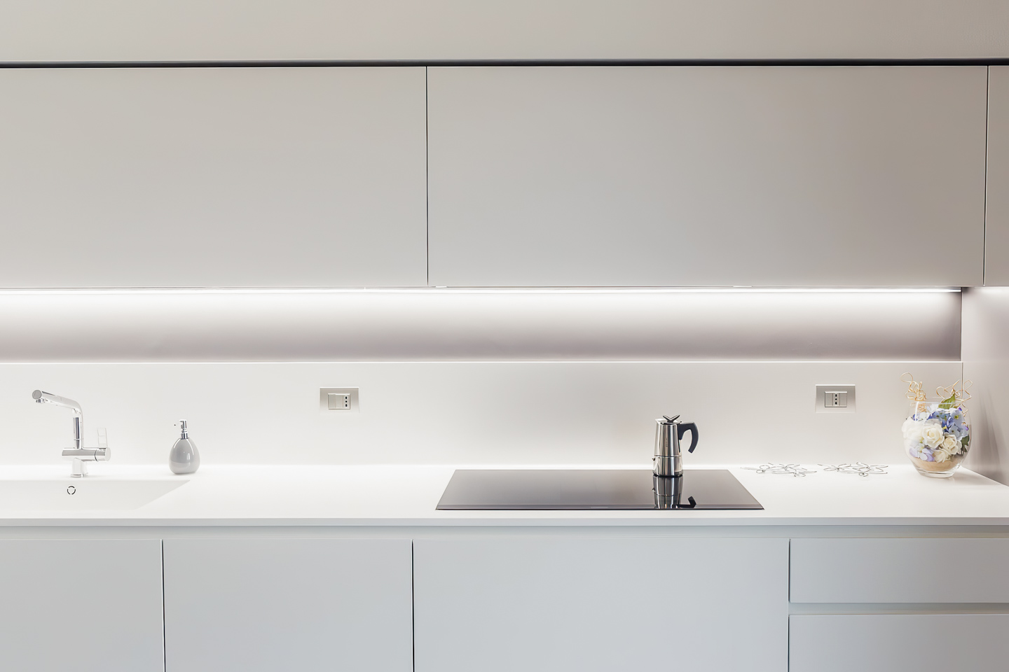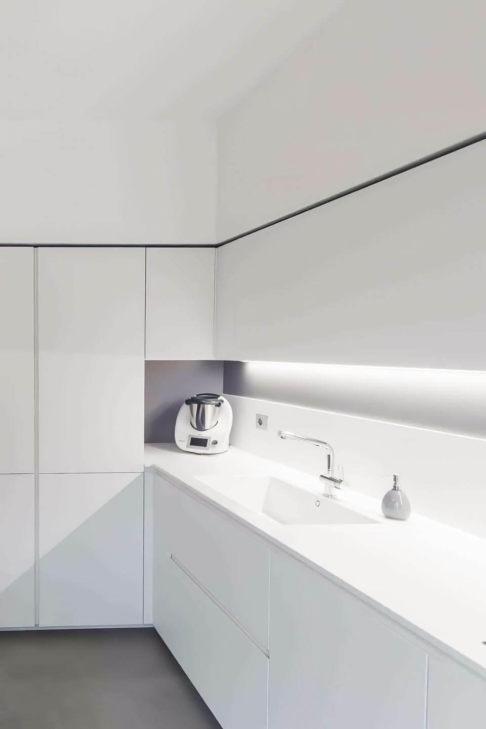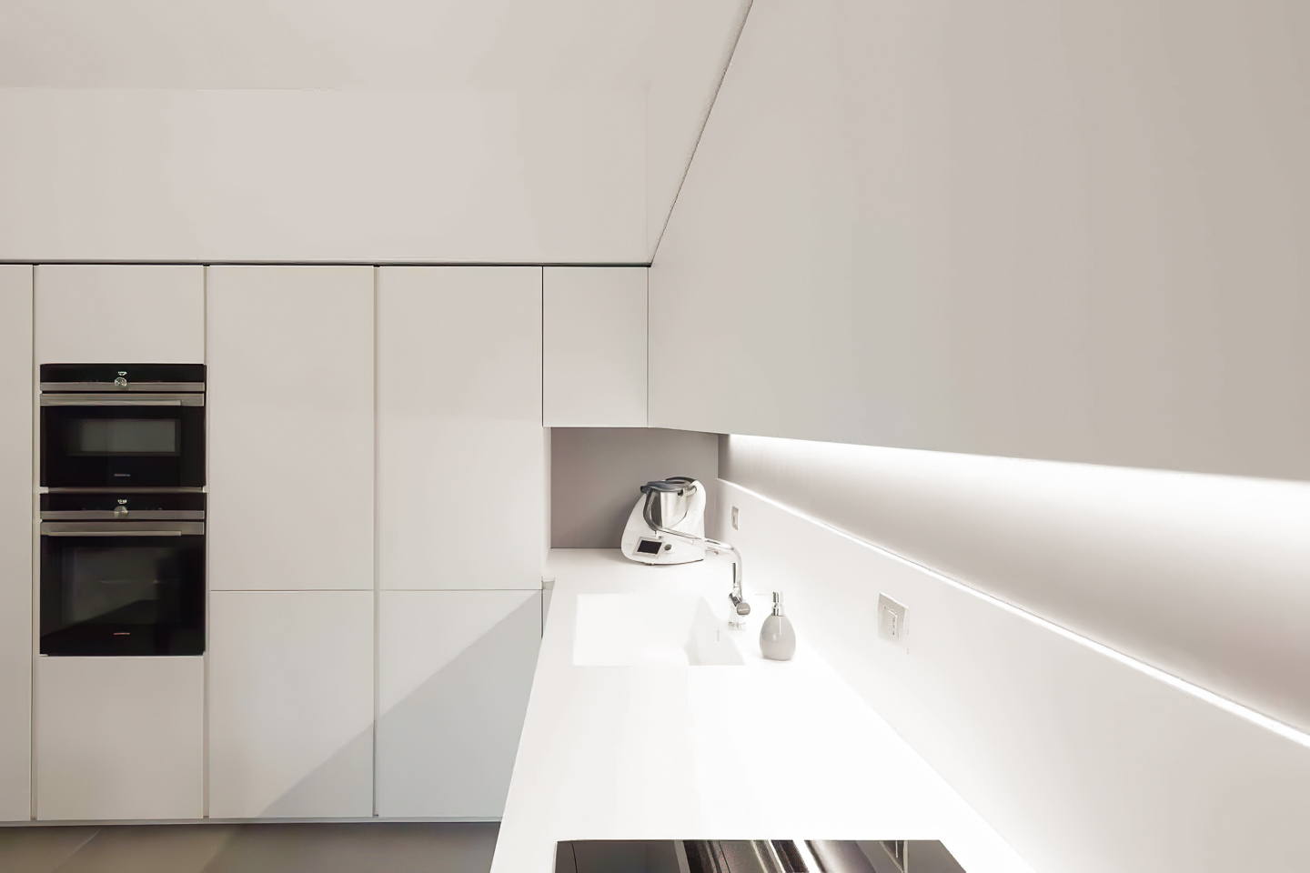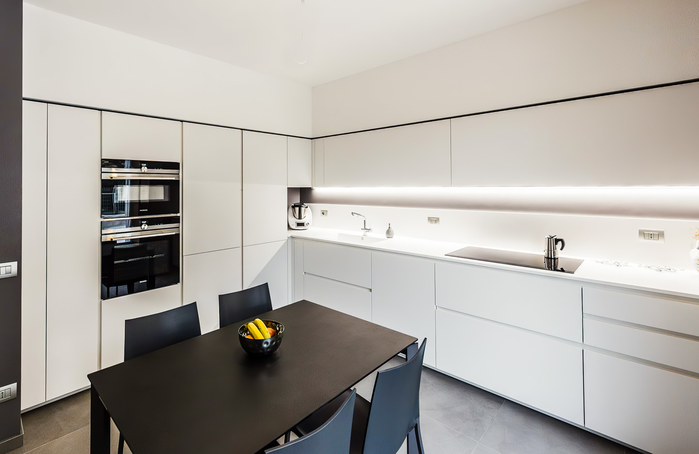 “White and light” could be the title of this kitchen. The volumes are integrated into the shapes of the false ceilings that accommodate the columns and wall units of the Y kitchen by Zampieri Cucine. The top also takes up the white theme: made of Corian, with the integrated basin, it amplifies the continuity with the elements of the kitchen. Thus the window overlooking the garden and the light bar under the wall units bring out the brightness, very present in this kitchen. The anthracite gray of the table and chairs and of the walls stands out against the white of the setting.