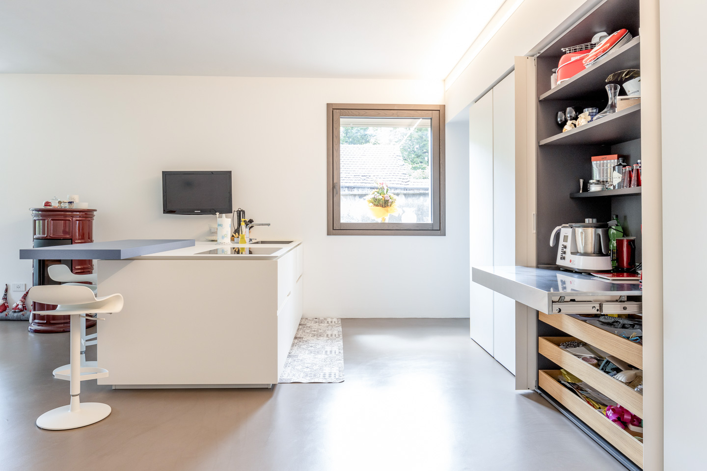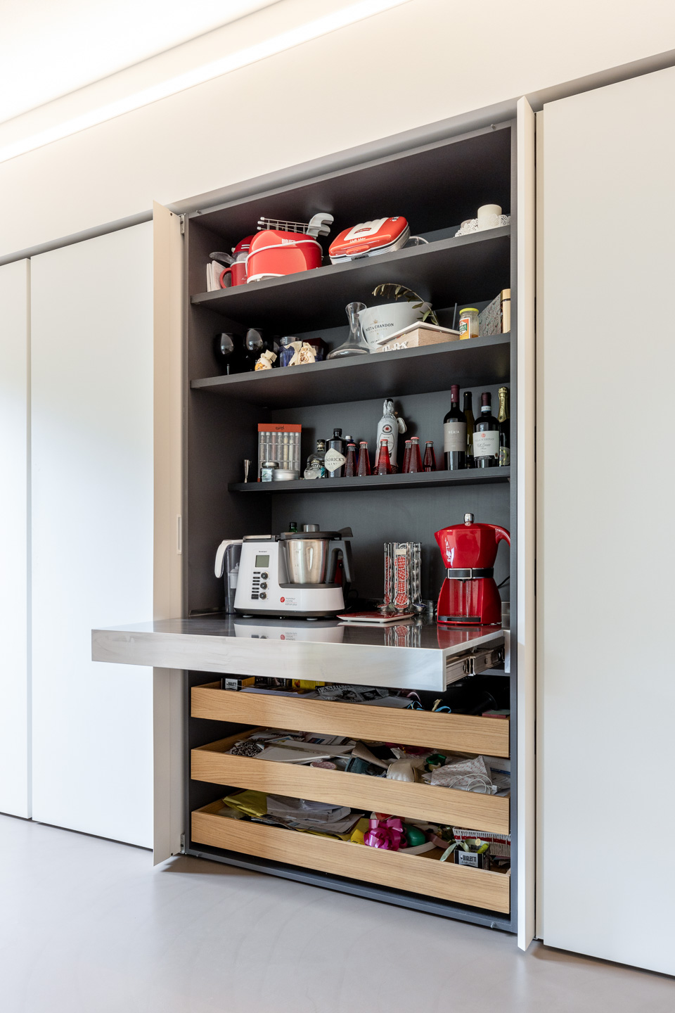 Y di Zampieri Cucine trova la sua massima espressione in questa cucina minimale dove il bianco è l’attore principale. La parete contenitiva ospita la dispensa e tutti gli elettrodomestici, nascosti da ante intere. All’occorrenza la colonna centrale diventa un comodo ausilio al top della penisola con il piano estraibile in acciaio dove, grazie ad un comodo spazio, i piccoli elettrodomestici sono sempre pronti all’uso.