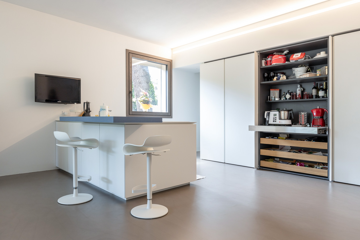 Un tocco di design, infine, è dato dagli sgabelli BCN di Kristalia, anch’essi ovviamente bianchi. L’azzurro del piano sporgente sulla penisola dà un tocco di colore senza stravolgere la “pulizia” del progetto.