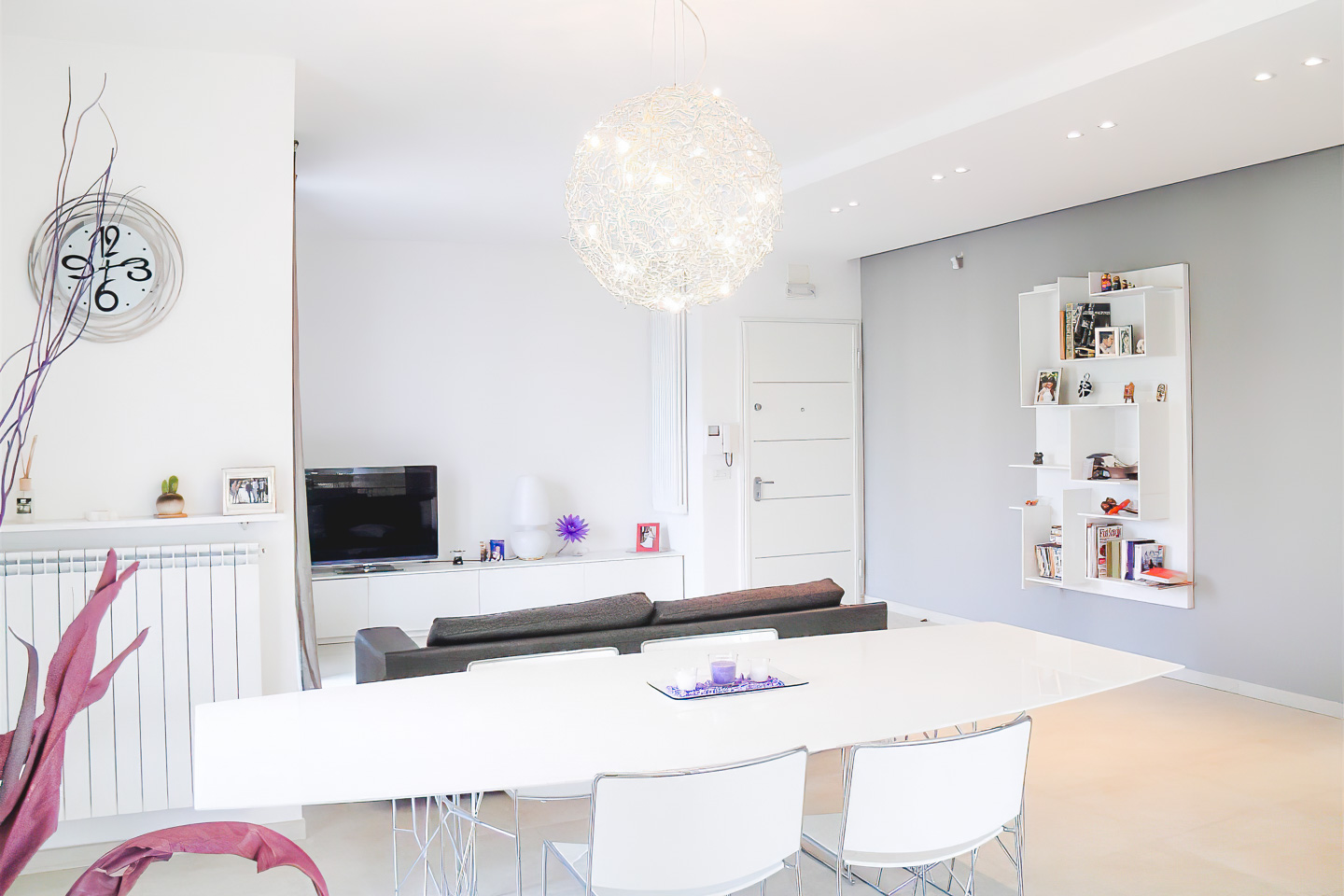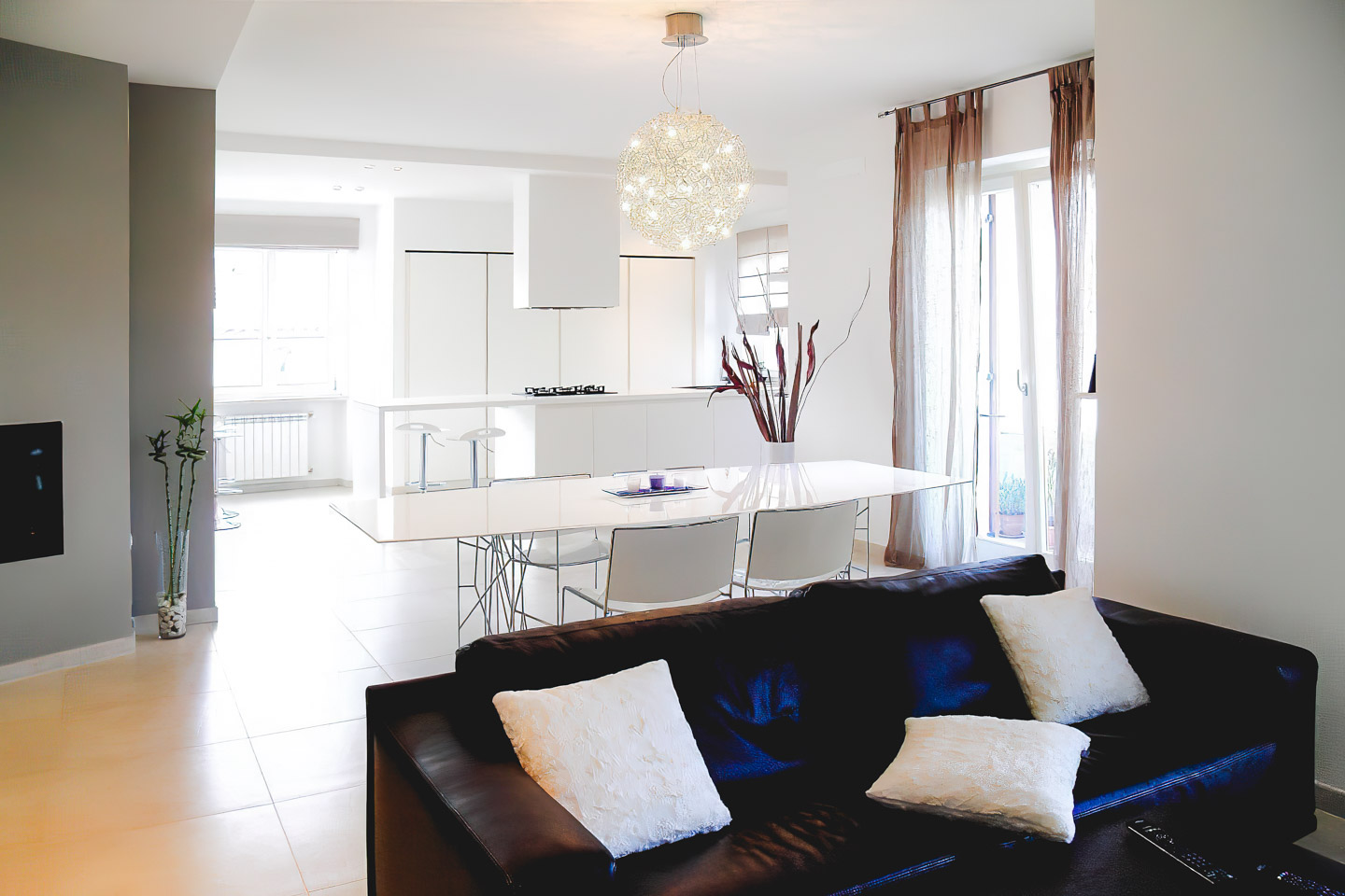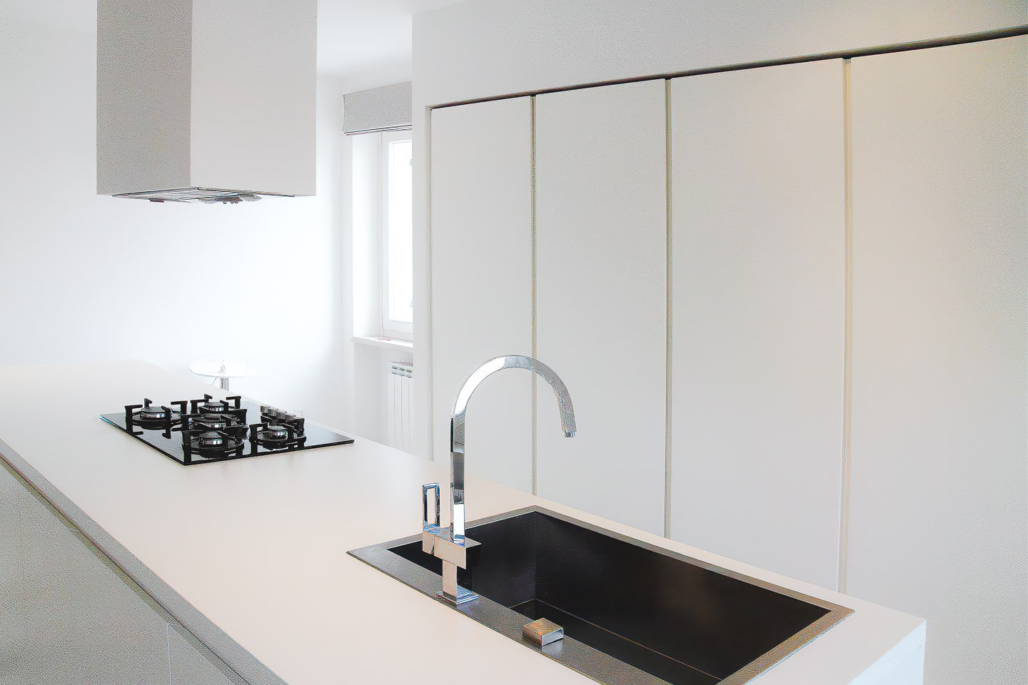 Il “black and white” di questo elegante appartamento sottolinea il desiderio del cliente di vivere in una casa minimale e calda allo stesso tempo. Il bianco e il nero degli arredi vengono declinati nelle sfumature del grigio dai toni  caldi delle pareti. Il risultato è un ambiente fresco, luminoso e accogliente.