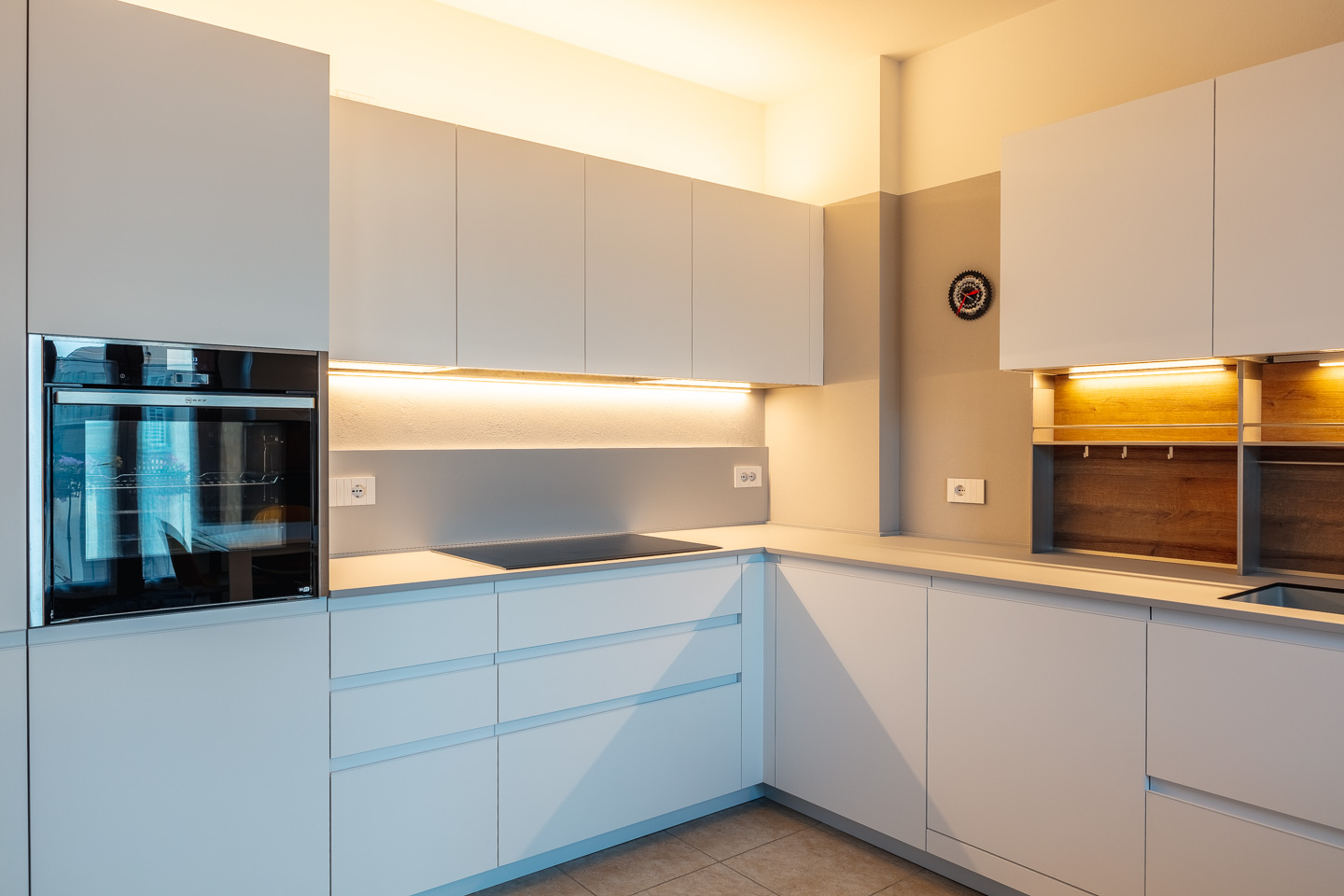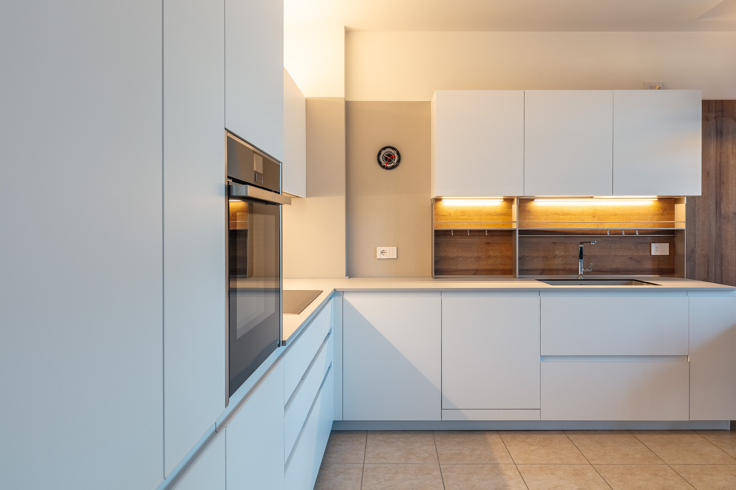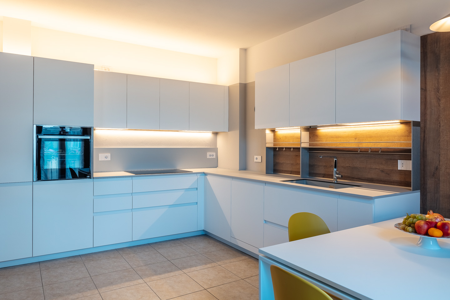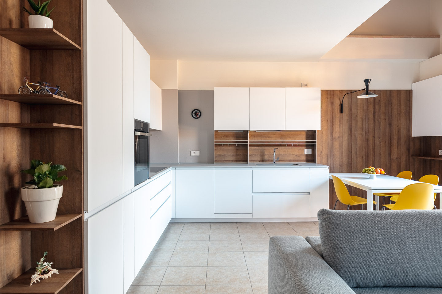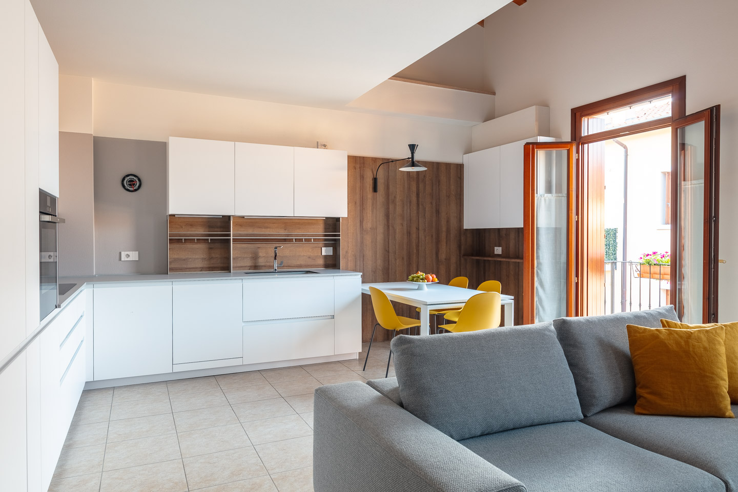 La cucina Lain di Euromobil sfrutta le due pareti irregolari equilibrate con il colore che riprende l’altezza dei pensili. Colori caldi che si abbinano alle pannellature finitura legno che vengono riprese nella zona pranzo. La Lampe de Marseille di Nemo, progettata da Le Corbusier illumina il tavolo integrato con la cucina. Lo spazio che si crea dà la possibilità di spostare il tavolo in centro stanza per i pasti conviviali con più persone.