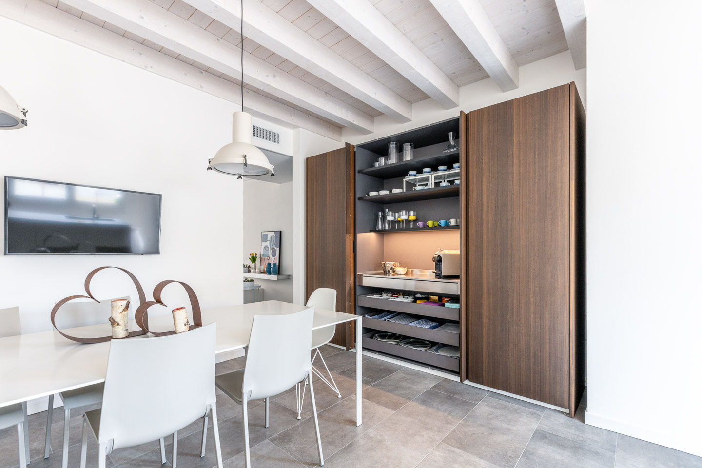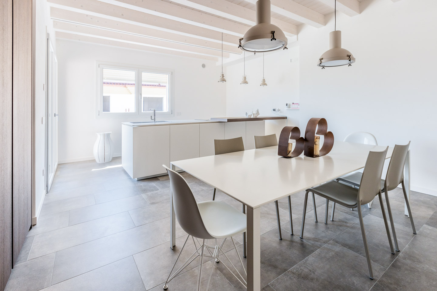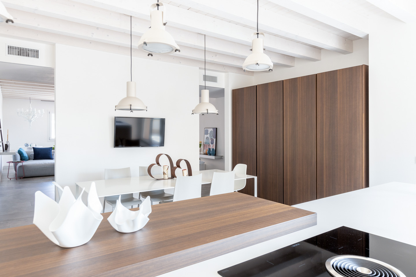 Il legno eucalipto delle colonne caratterizzano la cucina Y di Zampieri Cucine, aperta e allo stesso tempo divisa dal living. Alcuni elementi di design enfatizzano l’atmosfera minimale della casa quali la poltrona Up di B&B Italia, il tavolo Less di Molteni&C e le sedie Vitra.