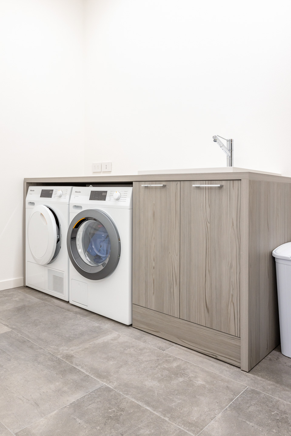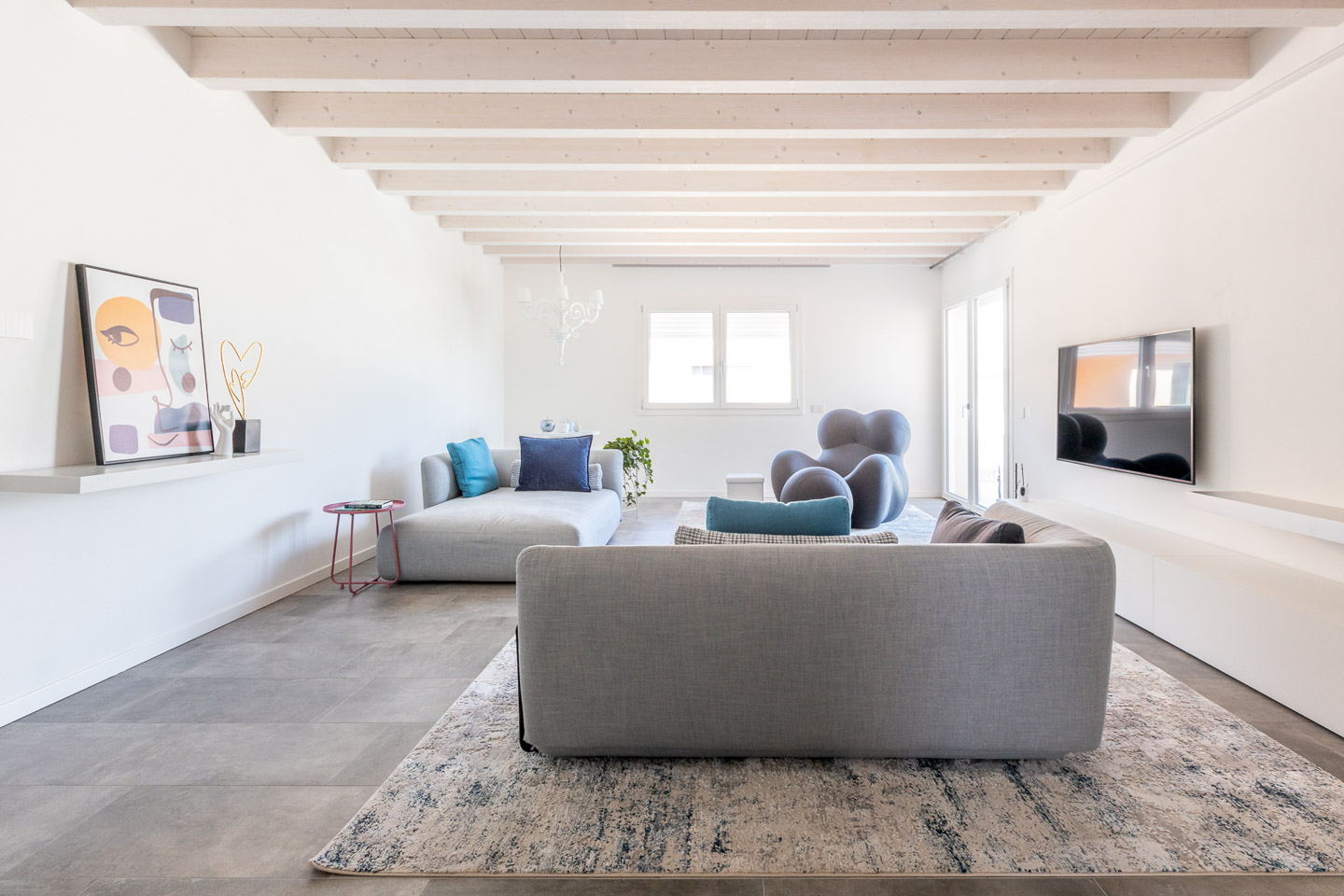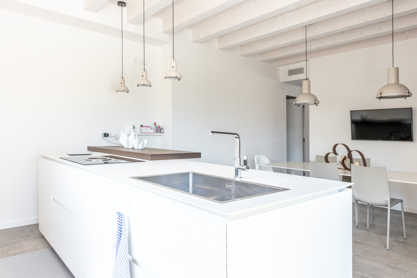 Il legno eucalipto delle colonne caratterizzano la cucina Y di Zampieri Cucine, aperta e allo stesso tempo divisa dal living. Alcuni elementi di design enfatizzano l’atmosfera minimale della casa quali la poltrona Up di B&B Italia, il tavolo Less di Molteni&C e le sedie Vitra.