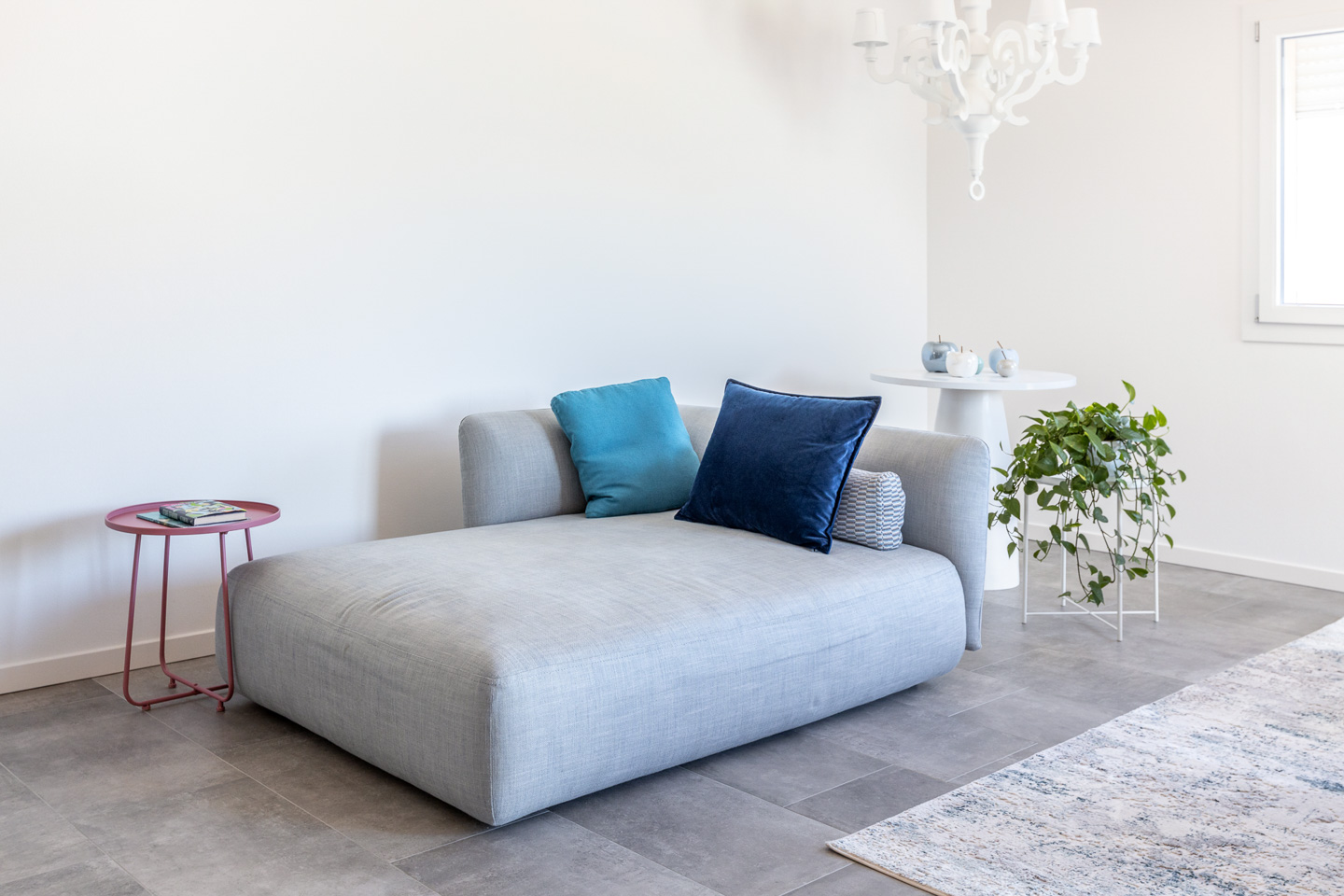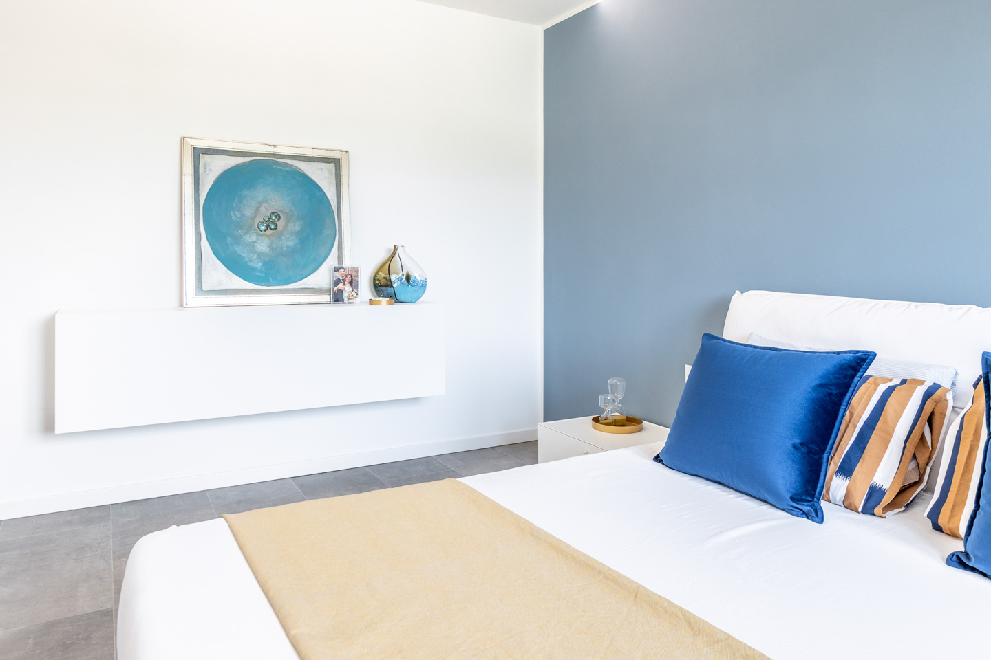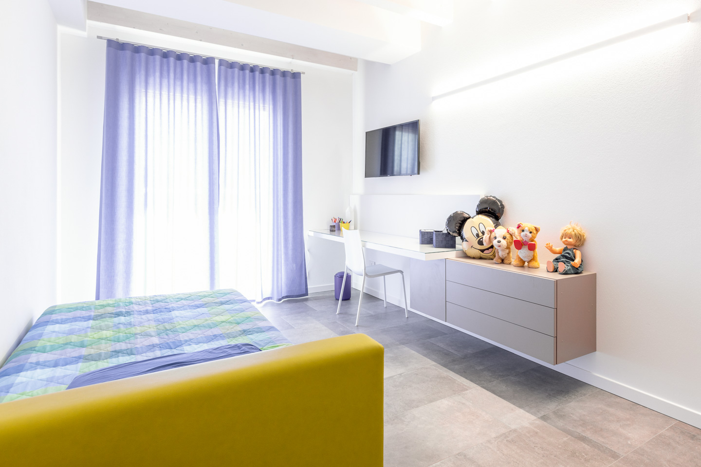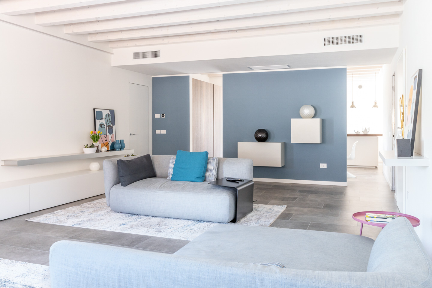 L’essenziale diventa raffinatezza, cura del particolare, combinazione felice di colori e materiali; questo appartamento al settimo piano gode di una bellissima vista sulle colline veronesi e la luce diventa il comune denominatore nelle varie stanze. I colori dominanti sono l’azzurro, il blu, il lilla ben equilibrati come nella zona living: il tenue tessuto del divano Cosy di MDF Italia che “fluttua” nella luce delle pareti bianche dove non ci sono mobili ma volumi minimali.