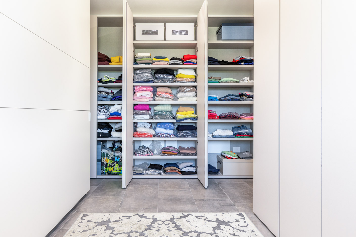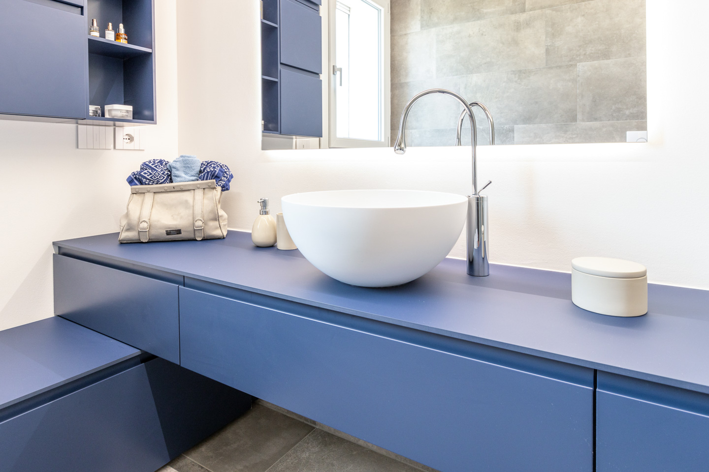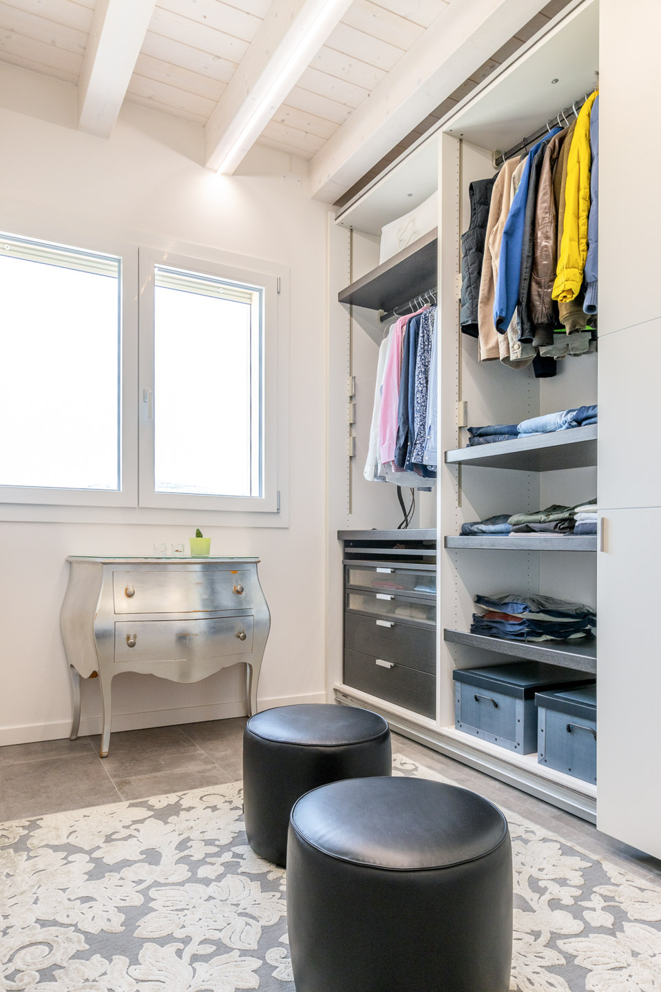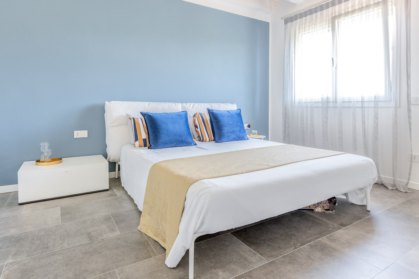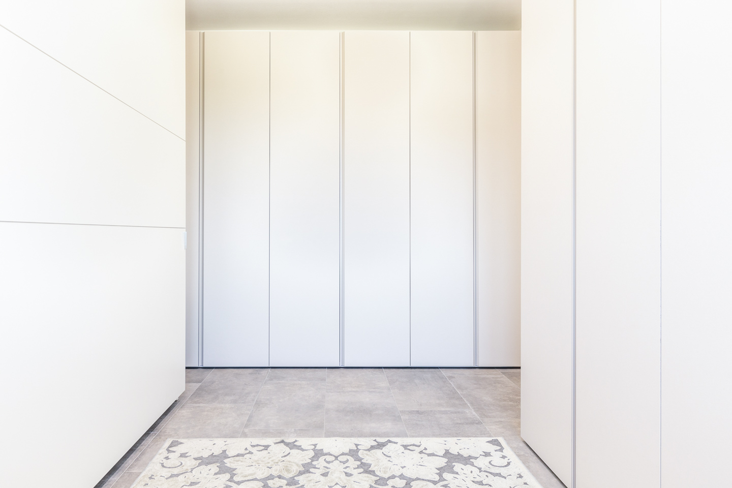 L’essenziale diventa raffinatezza, cura del particolare, combinazione felice di colori e materiali; questo appartamento al settimo piano gode di una bellissima vista sulle colline veronesi e la luce diventa il comune denominatore nelle varie stanze. I colori dominanti sono l’azzurro, il blu, il lilla ben equilibrati come nella zona living: il tenue tessuto del divano Cosy di MDF Italia che “fluttua” nella luce delle pareti bianche dove non ci sono mobili ma volumi minimali.