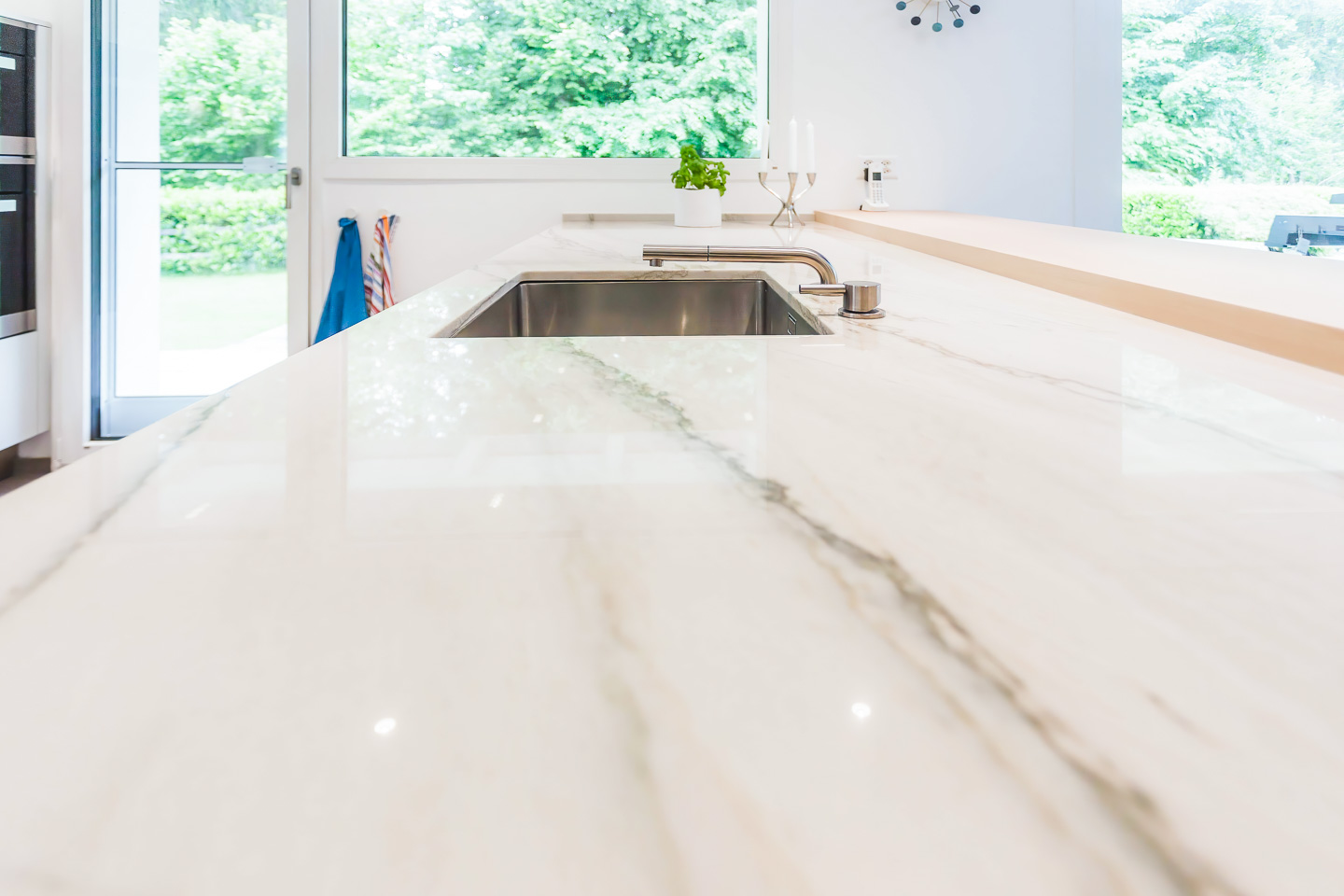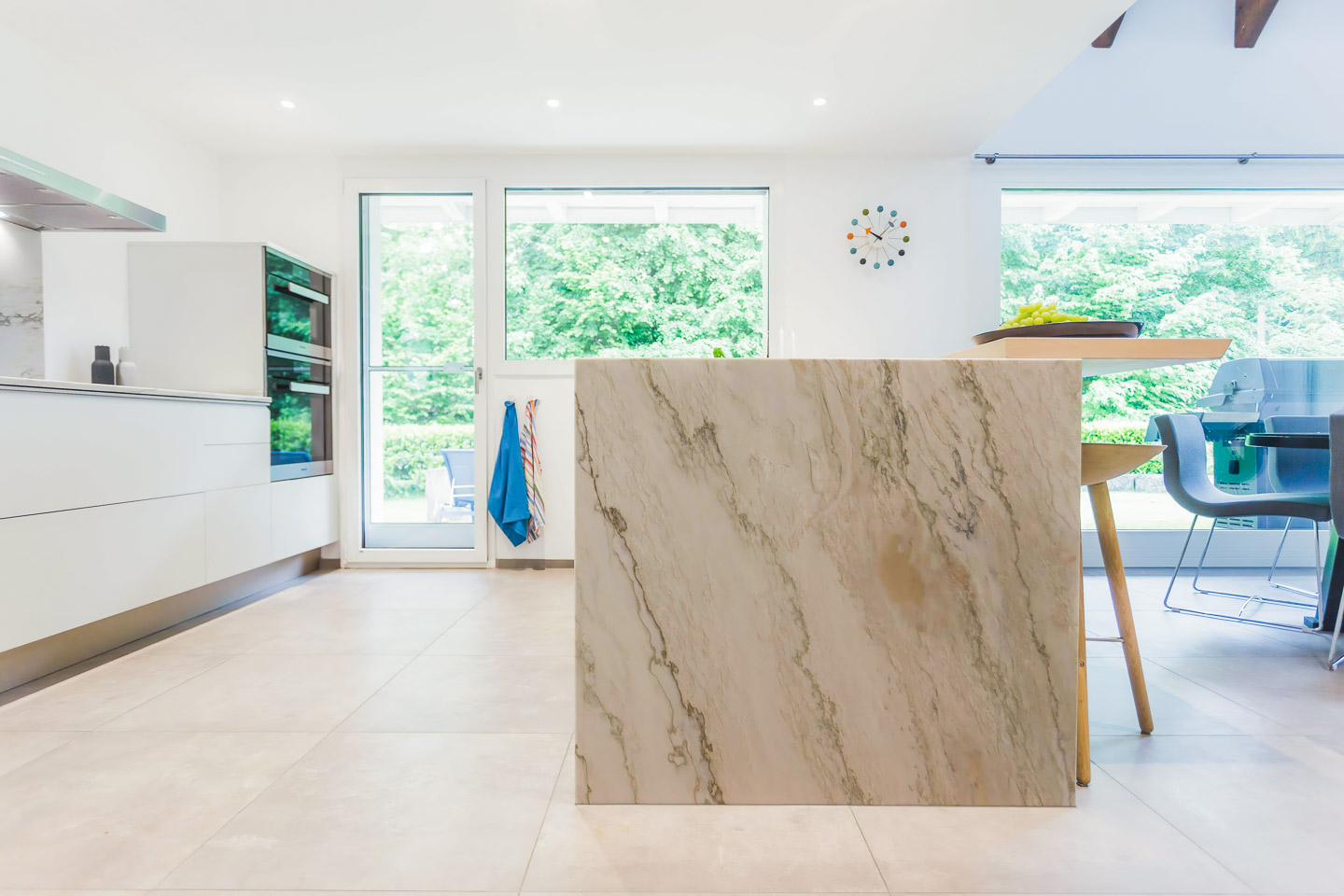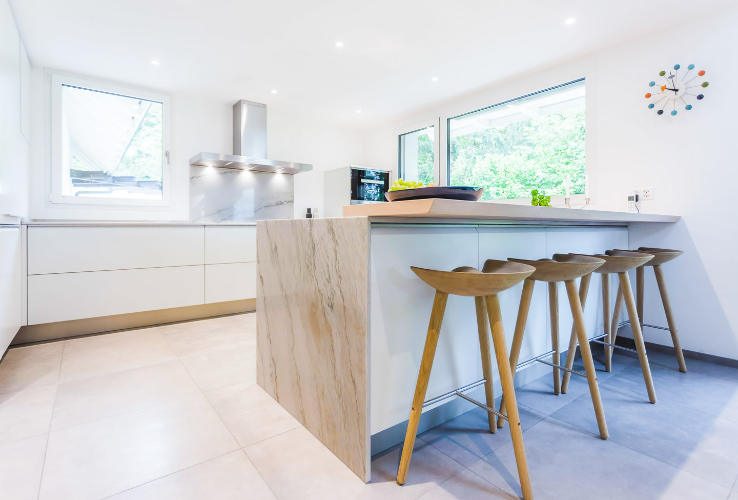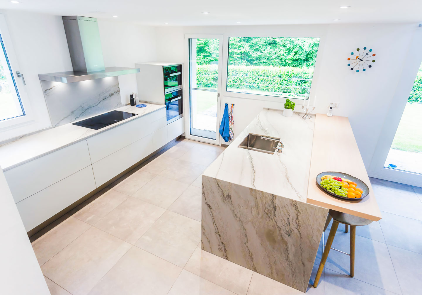 La necessità era di ampliare gli spazi visivi e dare luce ad un ambiente soffocato dalle travi presenti e da pareti che relegavano la cucina ad un angolo cottura: scegliendo materiali chiari, il top in granito White Macaubas e demolendo gli ingombri visivi, la cucina si è impadronita dello spazio esterno con l’aiuto delle ampie vetrate. Trim di Dada ben si colloca in questa cucina, dando luminosità con la sua discreta ed elegante presenza.